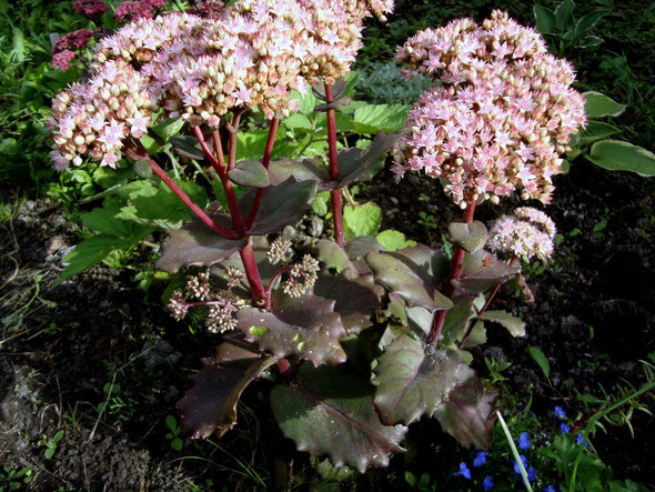 Саженец седума (очитка) сорта Крейзи Рафлз (Crazy Ruffles) высотой 40-50 см. Растение отличается красными стеблями и тёмно-коричнево-зелёными листьями с изящной гофрировкой. Цветы имеют нежный розовый оттенок.