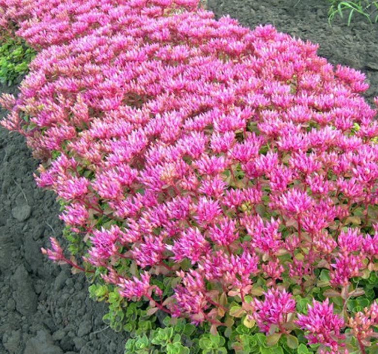 Очиток (седум) ложный Розеум – это почвопокровный многолетний суккулент, который привлекает внимание своими насыщенными розово-пурпурными цветами. Это растение высоко ценится за свою выносливость и неприхотливость в уходе. Листья у очитка супротивные, мясистые, цельные и ложночерешковые, окрашены в тёмно-зелёный цвет. Корневище у растения длинное и ползучее, с волокнистыми корнями. Стебли стелющиеся, с побегами и цветоносами, достигают высоты до 25 см и ширины до 55 см. Цветение начинается в июне и продолжается до конца лета, при этом обилие цветков полностью покрывает зелёную массу растения. Очиток Розеум размножается семенами, делением куста и черенкованием. Он морозоустойчив и подходит для зоны 4.